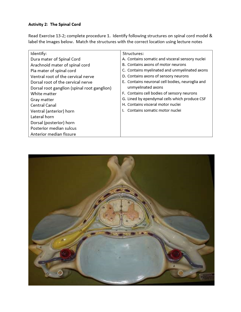 Solved Identify the following structures on the spinal cord - Chegg Identify the following structures on the spinal cord model & label the images below. Match the structures with the correct location using lecture notes Show transcribed image text Expert Answer 1.Duramater of spinal cordA 2. Arachnoid mater of spinal cord 3. Piamater of spinal cord 4. 5. 6. White matter 7. Dorsal horn 8. Lateral horn 9.